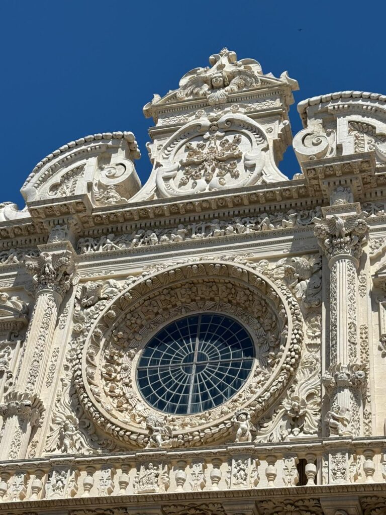 Na base, colunas robustas sustentam arcadas, criando uma sensação de solidez. Acima, surge um verdadeiro espetáculo: anjos, querubins, animais fantásticos, frutas, flores, símbolos vegetais. Tudo esculpido em pietra leccese, uma pedra calcária clara e maleável que permite um nível de detalhamento impressionante.
